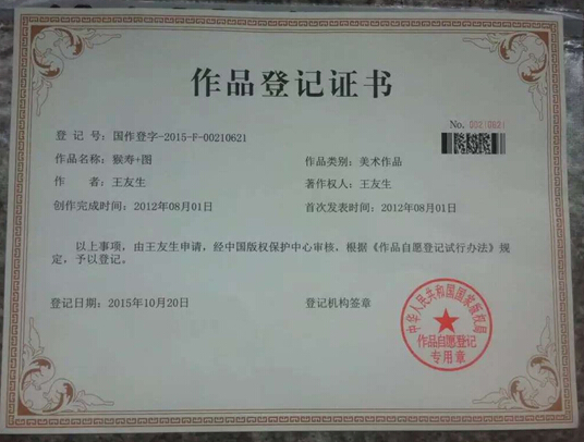 日前王友生“中国龙字书法”作品被正式列入“国家级非物质文化遗产名录”;最可贺的是,“太极龙字书画”,“猴寿书画”已分别获得国家知识版权保护中心一级作品著作权、国家版权作品登记证书,尤其是丝绸书法艺术堪称中华一绝,填补了中国书法史上的空白。有了这两项专利证书,可以说“中国孔雀舞之王”杨丽萍在云南大理,而中华龙文化创意书法艺术之首即在“龙之冠”、“猴寿之王”在四川南部。