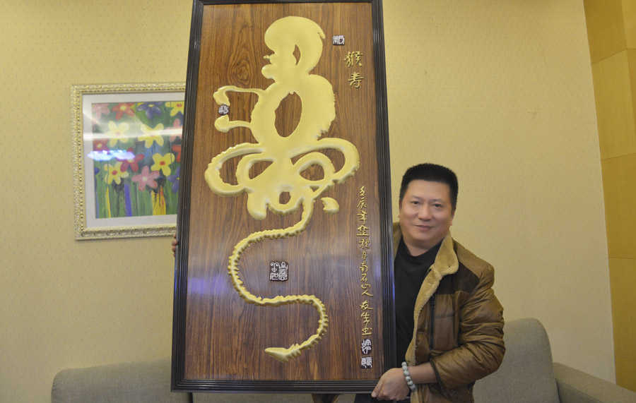 这个红木《猴寿》作品采用一块完整木材,把原书画作品放大拓印,用凸凹工艺雕刻而成,高为138厘米、宽69厘米,字面为金黄色,扁幅高端、大气、上档次,全国仅此一幅,具有永久性的观赏和收藏价值。
